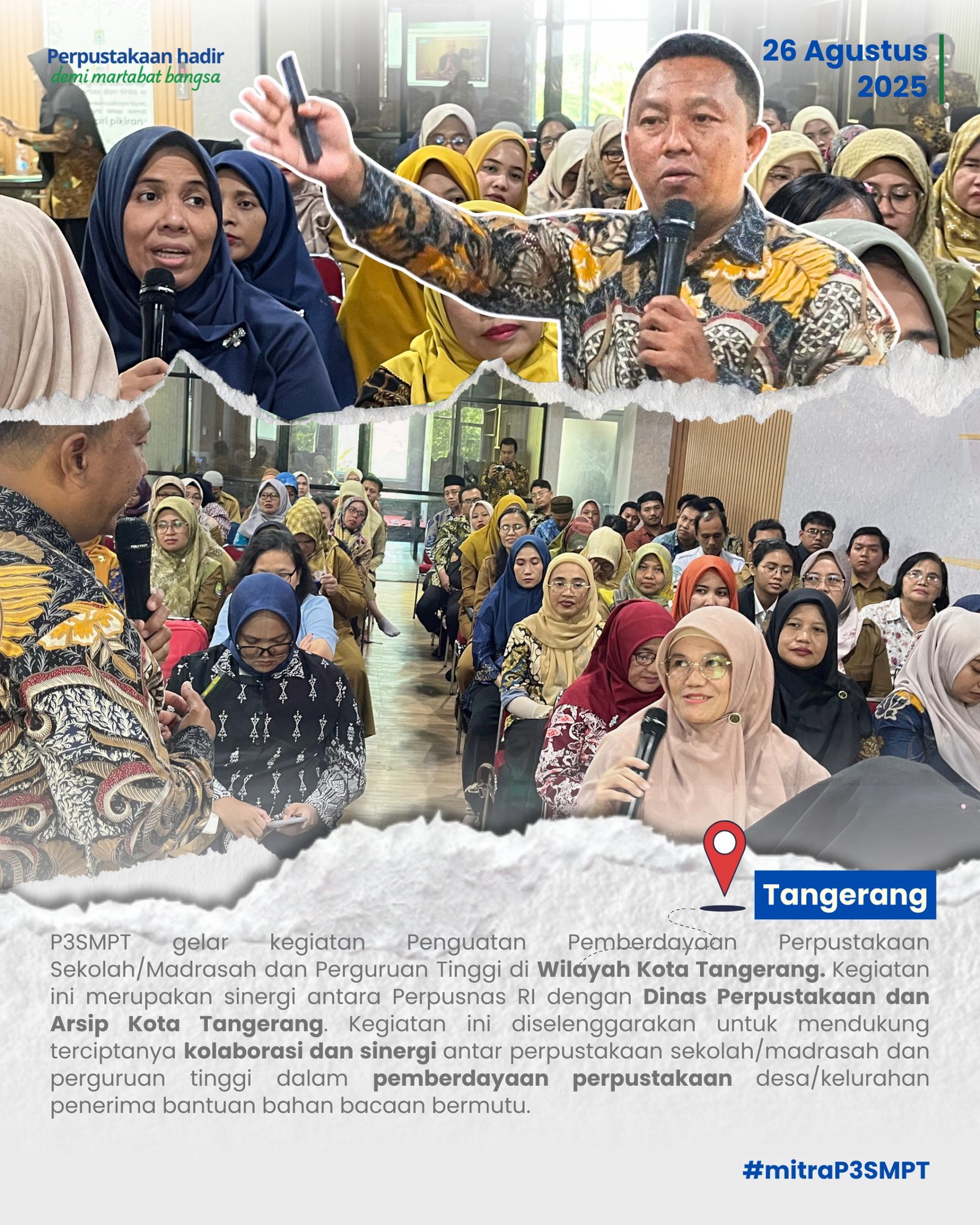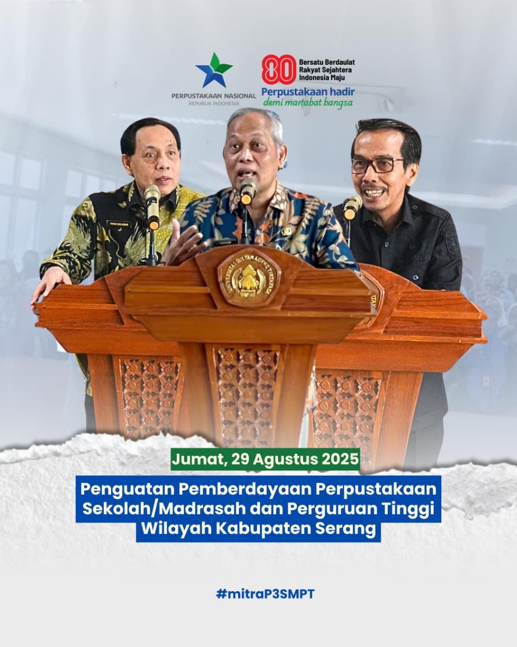 Serang (29/08/2025) – Perpustakaan Nasional RI melalui P3SMPT menyelenggarakan kegiatan Penguatan Pemberdayaan Perpustakaan Sekolah/Madrasah dan Perguruan Tinggi Wilayah Kabupaten Serang di Aula Perpustakaan Universitas Sultan Ageng Tirtayasa (UNTIRTA). Sejumlah 109…