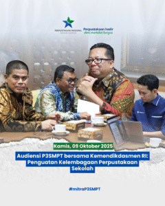 Jakarta (09/10/2025) – P3SMPT Gelar Audiensi dengan Staf Ahli Kemendikdasmen Bahas Penguatan Kelembagaan dan Integrasi Layanan Perpustakaan Sekolah. Audiensi dihadiri langsung oleh Staf Ahli Menteri Bidang Teknologi Pendidikan Kemendikdasmen RI, Ir. Moch. Abduh, MS.Ed., Ph.D. beserta jajaran dan Deputi Bidang Pengembangan Sumber Daya Perpustakaan, Dr. Adin Bondar, M.Si. beserta seluruh jajaran. Audiensi dilaksanakan di Gedung A Ruang Bali, Kemendikdasmen, Jakarta.