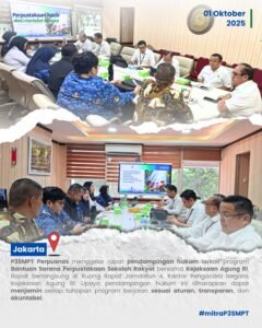 Jakarta (01/10/2025) – P3SMPT Perpusnas menggelar rapat pendampingan hukum terkait program Bantuan Sarana Perpustakaan Sekolah Rakyat bersama Kejaksaan Agung RI. Rapat berlangsung di Ruang Rapat Jamdatun 4, Kantor Pengacara Negara, Kejaksaan Agung RI dipimpin langsung oleh Direktur Pertimbangan Hukum, Rudy Irmawan, S.H., M.H.