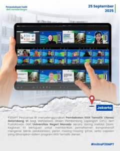 Jakarta (25/09/2025) – Perpusnas RI melalui P3SMPT melaksanakan Pembekalan KKN Tematik Literasi yang akan dilaksanakan oleh Universitas Manado. Pembekalan ini merupakan pembekalan ke-VI yang dilaksanakan oleh P3SMPT. Acara diawali dengan materi pengantar teknis kegiatan KKN Tematik Literasi oleh Zeinia Maulida, S.Hum selaku Pustakawan Ahli Pertama Perpusnas RI. Zeinia menyampaikan matriks dan arah tujuan kegiatan KKN Tematik Literasi yang akan dilaksanakan oleh mahasiswa Universitas Negeri Manado. “Melalui program ini, mahasiswa diharapkan berperan sebagai agen literasi di masyarakat dengan memusatkan kegiatan di perpustakaan desa dan Taman Bacaan Masyarakat, yang masih memerlukan peningkatan dalam aspek pengelolaan, fasilitas, maupun kegiatan” ujarnya.