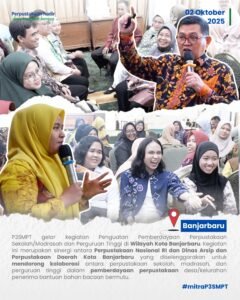 Banjarbaru (02/10/2025) – Perpustakaan Nasional RI melalui P3SMPT menyelenggarakan Penguatan Pemberdayaan Perpustakaan Sekolah/Madrasah dan Perguruan Tinggi di Kota Banjarbaru. Kegiatan yang berlangsung di Aula Gawi Sabarataan Pemko Banjarbaru ini diikuti oleh 109 peserta, meliputi pustakawan sekolah/madrasah, perguruan tinggi, serta perwakilan perpustakaan desa/kelurahan penerima bantuan buku bermutu.