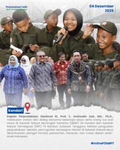 Kendari (20/12/2025) — Kepala Perpusnas RI, E. Aminudin Aziz melaksanakan visitasi ke Sekolah Rakyat Menengah Pertama (SRMP) 25 Kendari dan Sekolah Rakyat Terintegrasi (SRT) 70 Kendari, Sulawesi Tenggara. Kunjungan didampingi oleh Kepala P3SMPT, Taufiq A. Gani. Kunjungan ini dilakukan untuk memastikan bantuan sarana perpustakaan berupa buku, rak, dan anjungan baca digital dapat dimanfaatkan secara optimal sebagai penopang proses belajar siswa di sekolah rakyat.