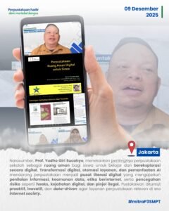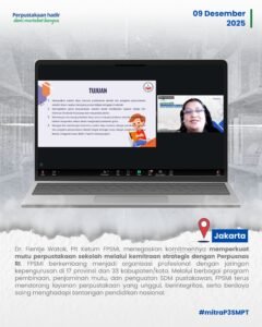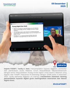 Jakarta (09/12/2025) – Webinar Forum Perpustakaan Sekolah/Madrasah dengan tema “Perpustakaan: Ruang Aman Digital untuk Siswa” diselenggarakan pada 9 Desember 2025 oleh P3SMPT Perpusnas RI bekerja sama dengan Forum Perpustakaan Sekolah dan Madrasah Indonesia (FPSMI). Kegiatan ini dibuka oleh Kepala P3SMPT, Taufiq A. Gani, yang dalam laporannya menyampaikan pentingnya webinar sebagai upaya meningkatkan wawasan tentang pemanfaatan layanan digital yang aman, efektif, dan mendukung literasi digital siswa. Ia berharap kegiatan ini mampu membantu sekolah dan pustakawan memahami praktik terbaik dalam menjaga keamanan digital peserta didik.